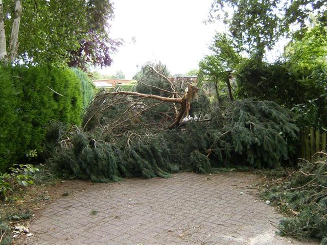 Tjonge jonge, wat komt daar nog veel van af als het op de grond ligt. Maar ja, zo gezegd, zo gedaan. We hebben samen alles in stukken gezaagd en opgeruimd en ‘buiten’ neergelegd. Toen dat net klaar was kwam Frans met z’n Polen en – mede door de hulp van Tineke – was de weg binnen een kwartier weer begaanbaar.