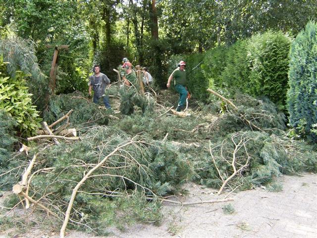 Met de overbuurman – die geen Madraskoelie maar een heel vriendelijke Turk blijkt te zijn – hadden we gisteravond die eikentak al een stukje verplaatst zodat hij zijn auto kon parkeren en onze heg weer vrij kwam. Omdat ‘ze’ de troep op ‘jouw’ terrein niet hoeven op te ruimen had Tineke vanmorgen vroeg al verzonnen dat we de boomtop zelf zouden ‘ontmantelen’ en op de straat zouden opstapelen.
